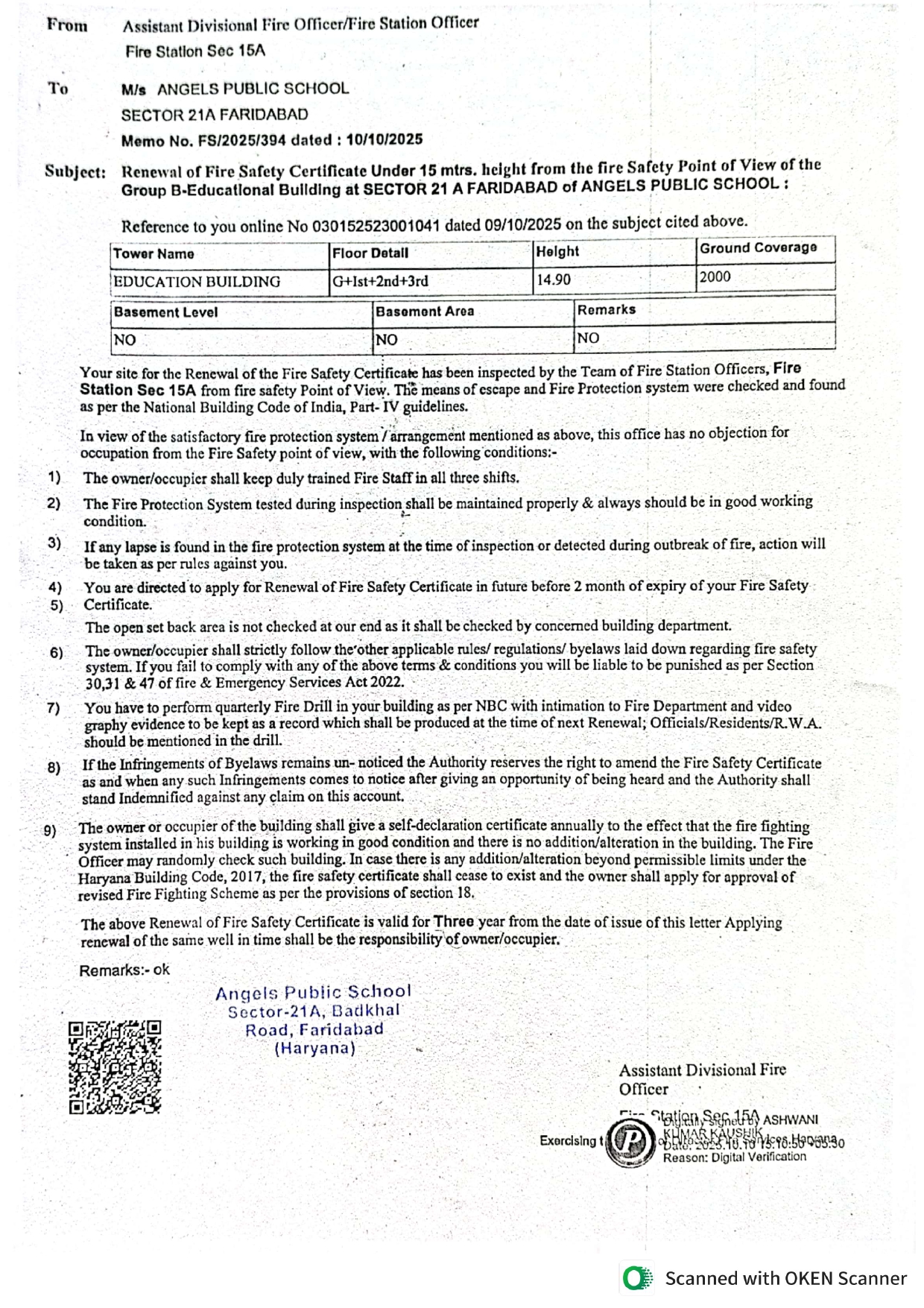This certificate ensures that the school has complied with all fire safety norms and has adequate fire protection systems as required by the Fire Department.