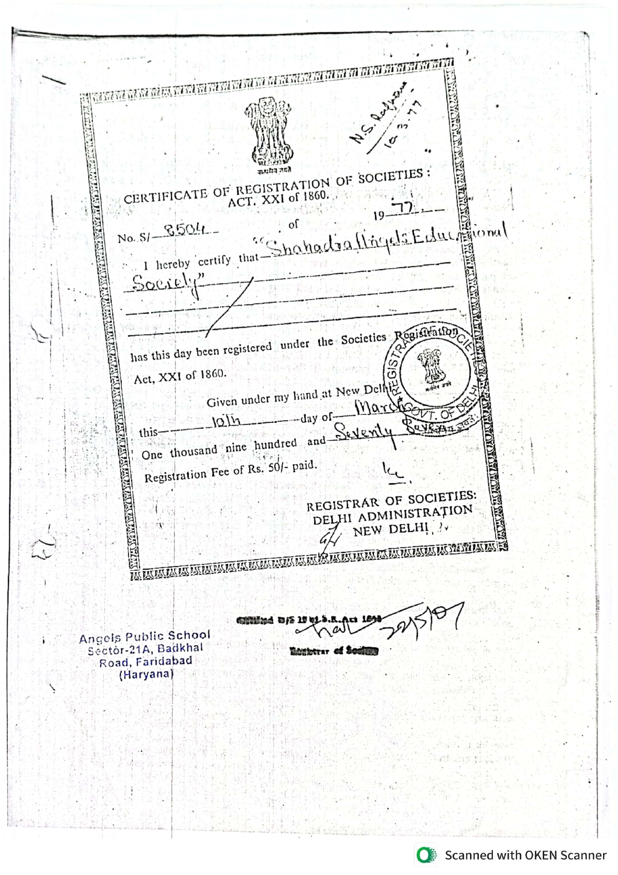 Angel Public School is managed by a registered society. Below is the official registration certificate.